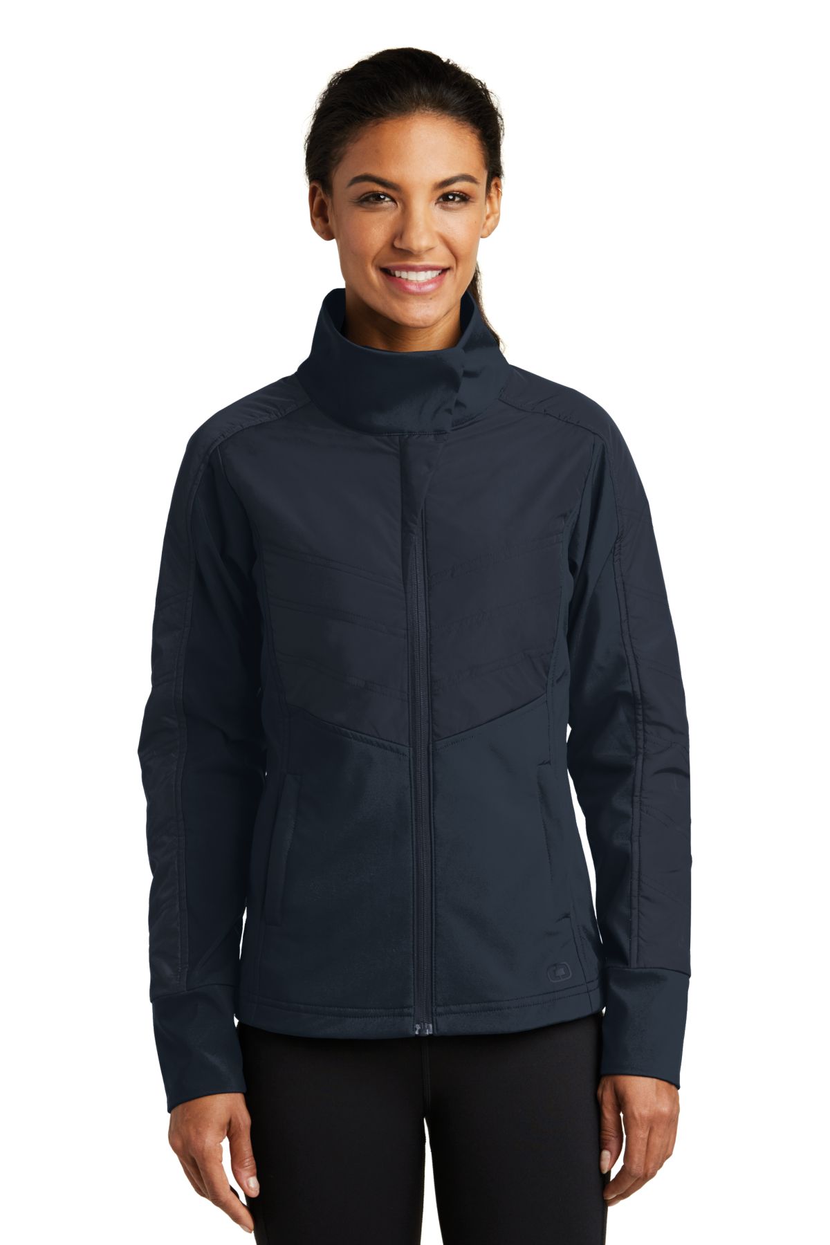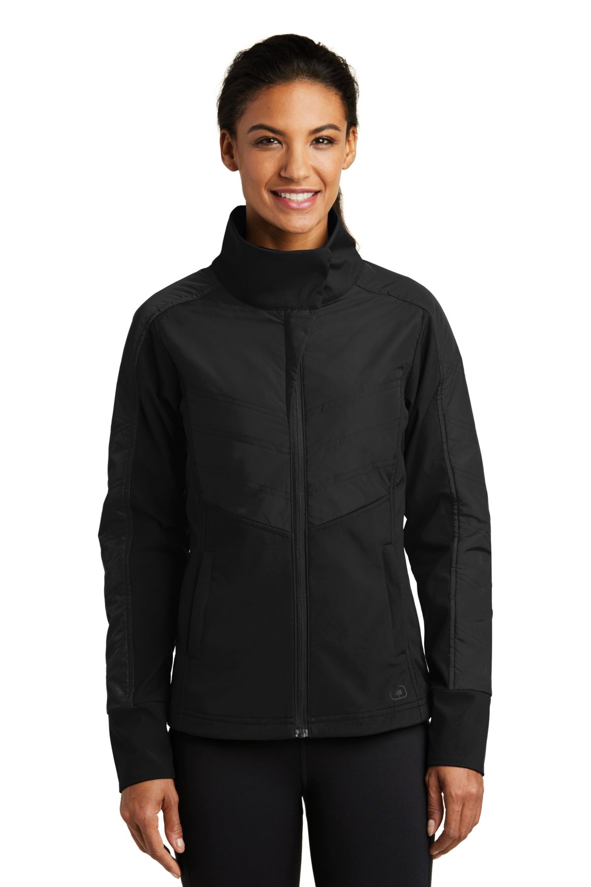 - PERFORMANCE HYBRIDWATER-RESISTANTWIND-RESISTANT 100% poly woven shell bonded to a 100% poly knit back with a laminated film insert for wind and water resistance 100% poly woven quilted overlays Core insulation Partial storm flap and tip forward collar Reflective OGIO Endurance heat transfer label for tag-free comfort Tonal rubber O at back right shoulder Rubber O Endurance at back left panel Reverse coil zippers Rubber-wrapped O zipper pull OGIO metal snap Set-in sleeves Front zippered pockets Tonal rubber O at left hem
