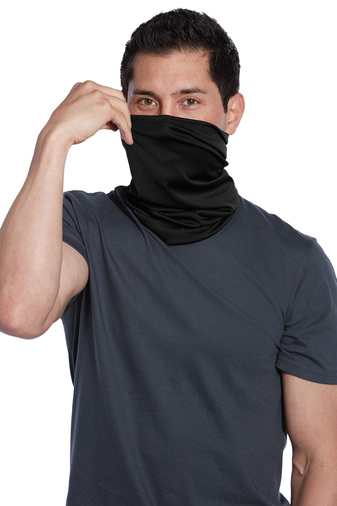 - This gaiter serves as a multi-functional versatile face covering as well as a headband neckerchief hood and sun guard. Pull over head arrange at neck and pull up to cover head and face as desired. 95/5 poly/spandex UPF rating of 50+ Dimensions: 19 x 9 Machine washableNon-returnable